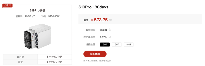 以比特大陆旗下最新的蚂蚁S19Pro矿机,周期180天及30T算力的云挖矿套餐,价格为573.75美元,历史产出率为9.87%。根据近期币价和挖矿难度,历史回本周期为163天。