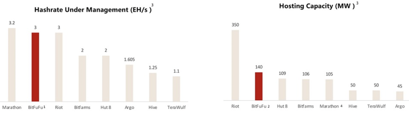 在创始人之间的控制权争夺期间,比特大陆上市进度已晚于嘉楠科技和亿邦国际。如今,詹克团和吴忌寒两个阵营关联的云挖矿平台将在纳斯达克同台竞技。投资者演示文稿中,比特富富将Marathon、Riot、Bitfarms、Hut8、Argo、Hive、TeraWulf作为头部平台比较,未提及比特小鹿Bitdeer。