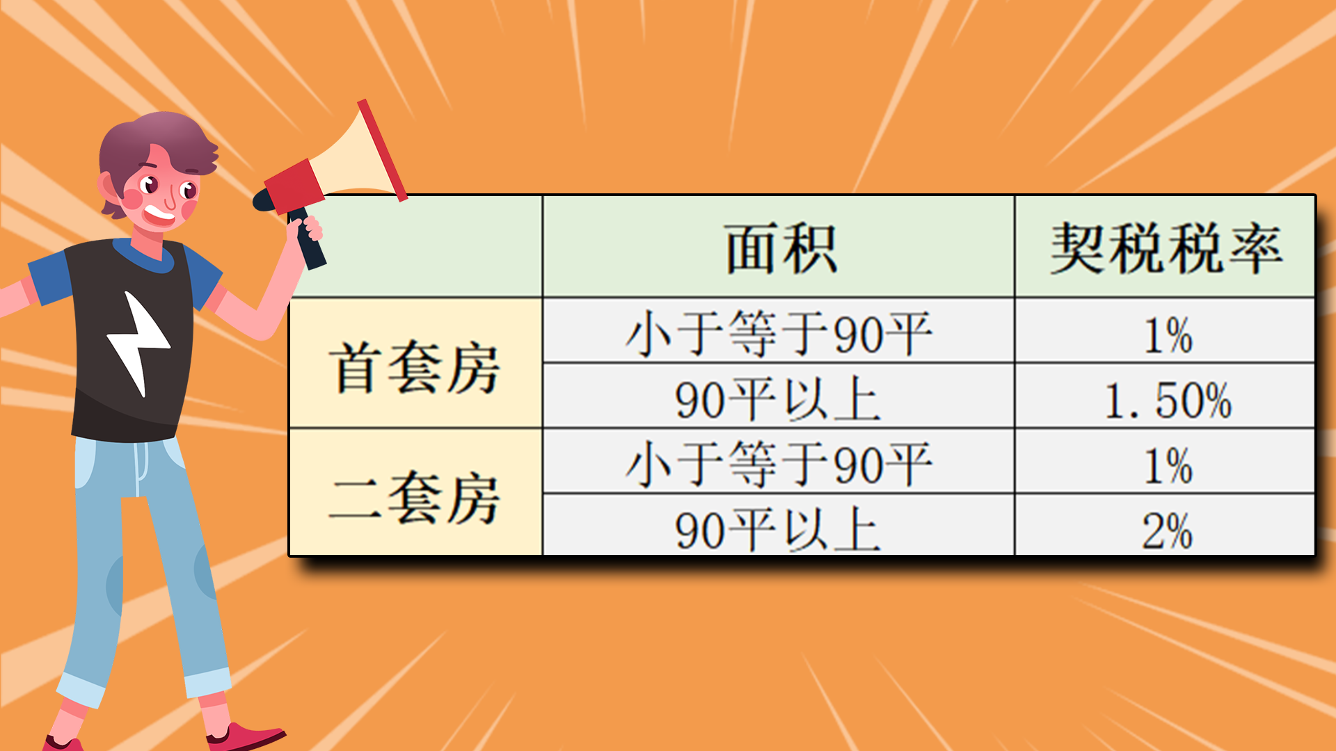 契税征税标准全国统一,如果是首套房,面积小于等于90平,按网签价的1%征税,面积90平以上,契税契税税率为1.5%;二套房,面积小于等于90平,税率为1%,面积90平以上,契税税率为2%,购房者可以根据自身情况计算需要缴纳的契税。举个例子,如果看中的房子建面80平方米,总价100万,购房者是首套房,则需要缴纳的契税费用=1000000×1%=10000元。