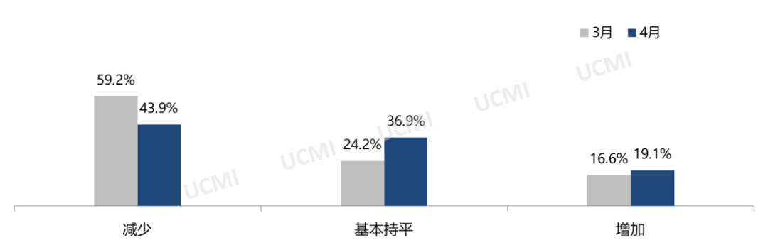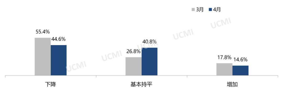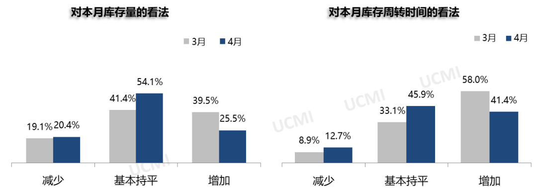调查显示,4月份库存量与库存周转时间均有所增加。其中认为库存量“增加”的经理人比例为25.5% ;认为库存周转时间“增加”的比例为41.4%。