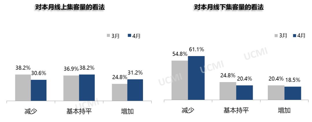 调查显示,4月份线上集客量基本持平、线下集客量有所减少。其中认为线上集客量“基本持平”的二手车经理人比例为38.2%;认为线下集客量“减少”的经理人比例为61.1%。