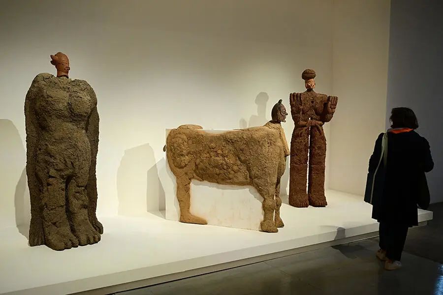 黎巴嫩艺术家阿里·谢里(Ali Cherri)的《泰坦》(Titans, 2022)由三个泥土制成的具象雕塑组成,基于拉玛苏等其他古代神,结合了动物和人的形象。作品强烈地唤起了双年展对于世俗超现实主义这一主题的探讨。《泰坦》的旁边是谢里的另一件作品,三屏影像《人、神和泥土的》(Of Men and Gods and Mud, 2022),影片抒情地讲述了我们的生活同水、泥土与行星的关系。在某个时刻,一个画外音响起:“如果神是以自己的形象塑造了我们,那么神一定也是由泥土创造而成的。”泰坦的形象表明,我们的身体比我们所以为的更加与自然紧密相连。展墙上的文字将这一作品与唐娜·哈拉维(Donna Haraway)在《当物种相遇》(When Species Meet, 2007)中提出的黏液(slime)概念联系起来。