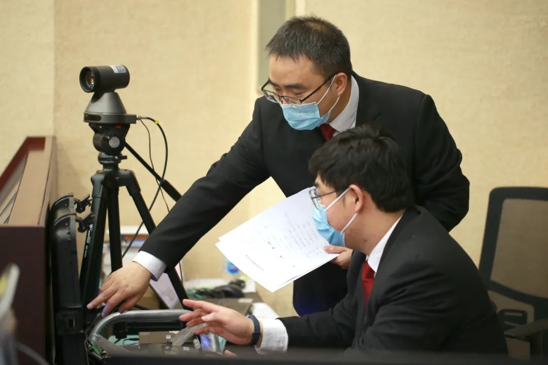 图为上海高院信息管理处副处长吴海崟与干警吴越在视频会议召开前紧急调试设备。王晓波 摄