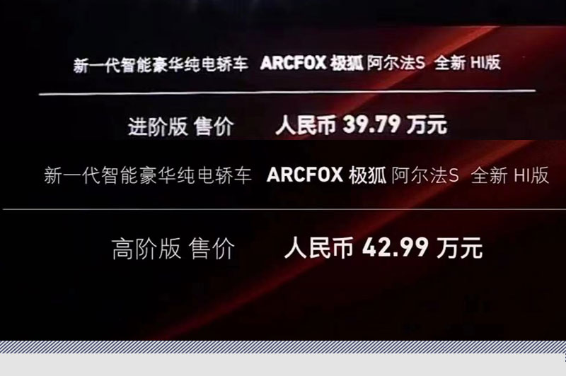 5月7日,网通社从极狐汽车官方获悉,极狐阿尔法S(配置|询价)全新HI版正式上市,共推出2款车型,官方指导价为39.79万元-42.99万元。新车最大的亮点是搭载了华为全套智能汽车解决方案,配备3颗激光雷达,可实现城市深度全场景高阶智能驾驶辅助。极狐阿尔法S全新HI版 官方指导价车型售价(万元)进阶版39.79高阶版42.99