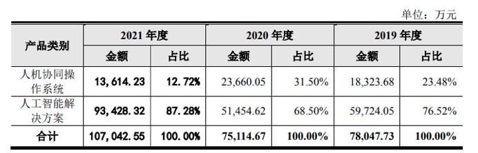 公司产品可分为人机协同操作系统和人工智能解决方案。其中,人工智能解决方案为公司贡献了大部分收入,于报告期内分别为5.97亿元、5.15亿元及9.34亿元,占主营业务的比例分别为76.52%、68.50%及87.28%。值得一提的是,该产品2021年的营收快速增长,这主要是因为公司紧跟国家新基建战略导向,人工智能解决方案中相关新基建项目在手订单顺利执行。