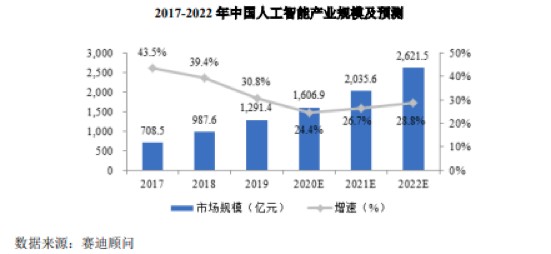 近年来,中国人工智能产业处于高速建设阶段,核心产业规模呈现爆发式增长,涌现出大量人工智能企业。2019年,中国人工智能产业规模达到1291.4亿元,同比增速为30.8%。而随着新兴技术逐渐成熟应用并形成协同效应,更多的创新应用将成为可能,中国人工智能产业将迎来新一轮的增长点。预计到2022年,中国人工智能产业规模达到2621.5亿元,增长率为28.8%。