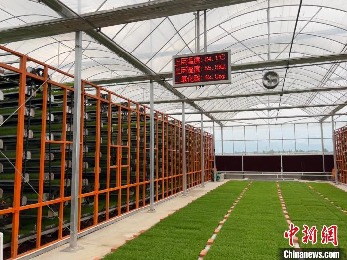 龙头镇智能育苗中心负责人张雷介绍,传统的小田育秧再插秧至田地里,费时费力且易受天气影响,很容易出现缺苗、弱苗等现象,影响产量和粮食安全,工厂化育秧中心全程动态控制湿度、温度、光照等因素。图为智能化育苗中心。 李一璠 摄