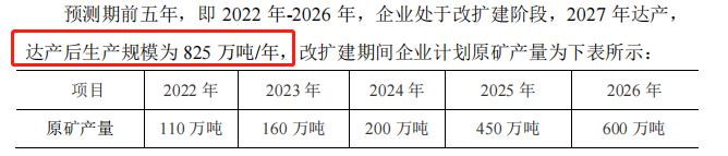 公开资料显示,宇邦矿业是由国城矿业收购所得,收购时其所有者权益账面价值为1.26亿,而评估值高达15.88亿,溢价率达到1,157.56%。在此次收购过程中,溢价最大就是宇邦矿业采矿权所确认的无形资产。 2020年的评估报告显示,在采矿权的评估中,假设根据2018年编制完成的可研设计方案采矿权生产规模由60万吨/年,扩产建设规模至825吨/年。在此次问询函的回复中,国城矿业表示,预测2027年宇邦矿业的将达产,生产规模将达825吨/年。