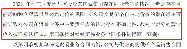 对于采取总额法或净额法确认贸易业务收入相关依据与合理性,国城矿业从锌锭业务、煤炭业务两个方面进行了分析。 在锌锭业务上,国城矿业表示,2021年前三季度因存在同业竞争情况,故对营业收入按净额法确认。然而到了第四季度,国城矿业就对锌锭业务合同进行逐一甄别,将其中部分收入确认为总额法。