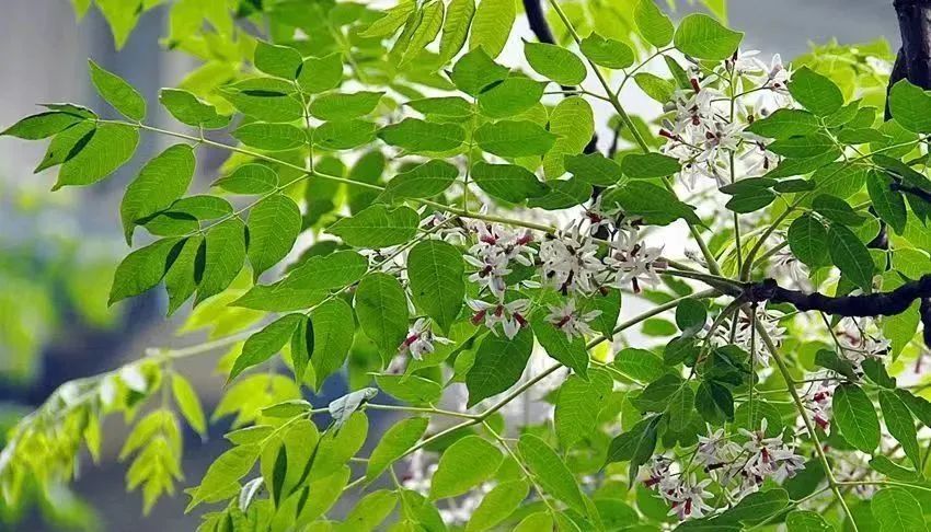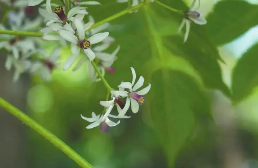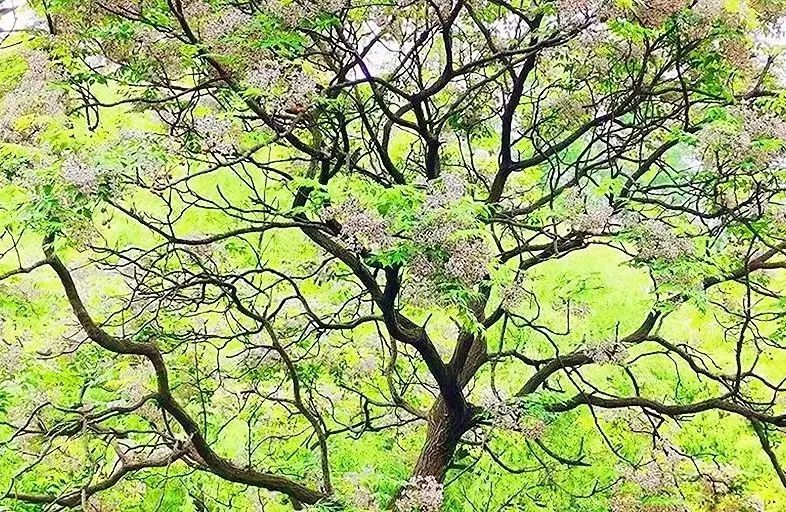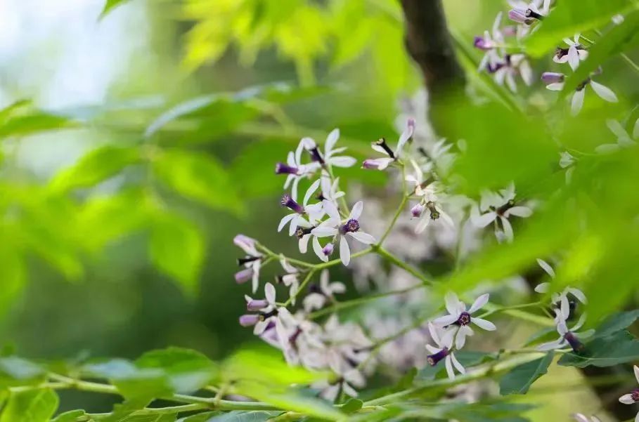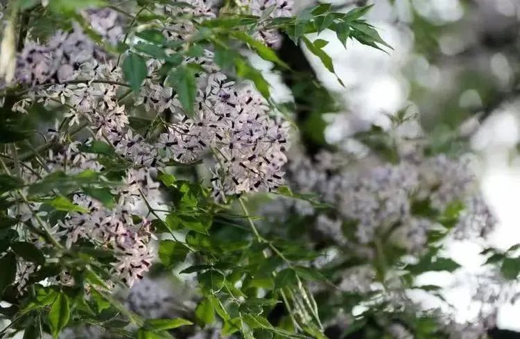 楝花是浅夏里开得最早也最为俏丽的树花,花瓣素白,花型雅致,静美玲珑。娇花、细叶与高树,如此悬殊的差异对比,使得楝花开时格外引人注目。