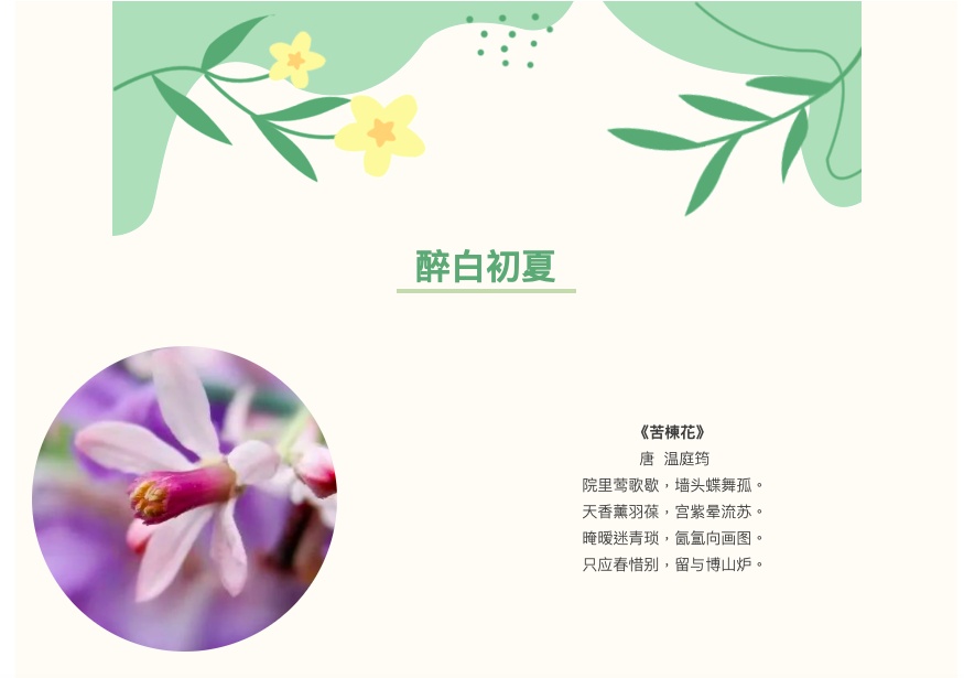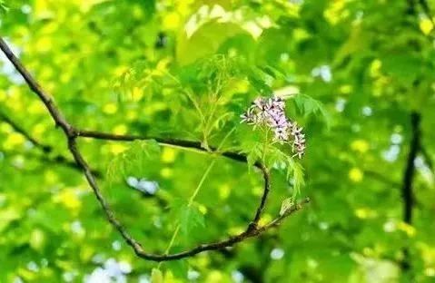 《三柳轩杂识》有载,“楝花为晚客。”也许就是因其花开在春天的最后,姗姗来迟,故云。历代文人墨客也留下了不少咏楝花的诗词。如宋王安石的“小雨轻风落楝花”,写的虽然是花落之状,但使人读后并无春光易逝那种伤感之情;而杨万里的“只怪南风吹紫雪,不知屋角楝花飞”诗句,读来流畅自然,隽妙无穷,寓意着在南风轻拂“紫雪”飘舞中,一个生机蓬勃的夏季已然来临。