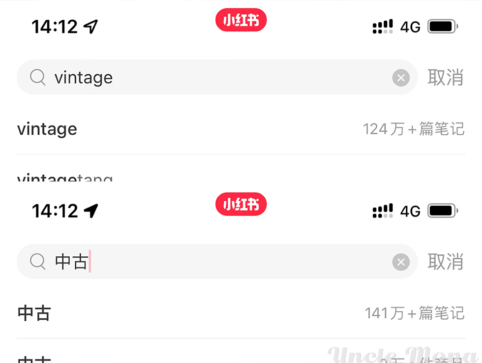 换成「中古、vintage」关键词,则能搜到百万篇笔记。