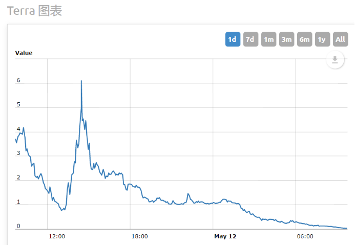 记者注意到,加密货币的这一轮暴跌或与号称挂钩美元的稳定币Terra暴跌有关。目前,Terra价格已与美元处于严重脱钩状态。