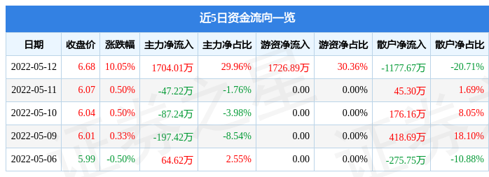 资金流向数据方面,5月12日主力资金净流入1704.01万元,游资资金净流入1726.89万元,散户资金净流出1177.67万元。