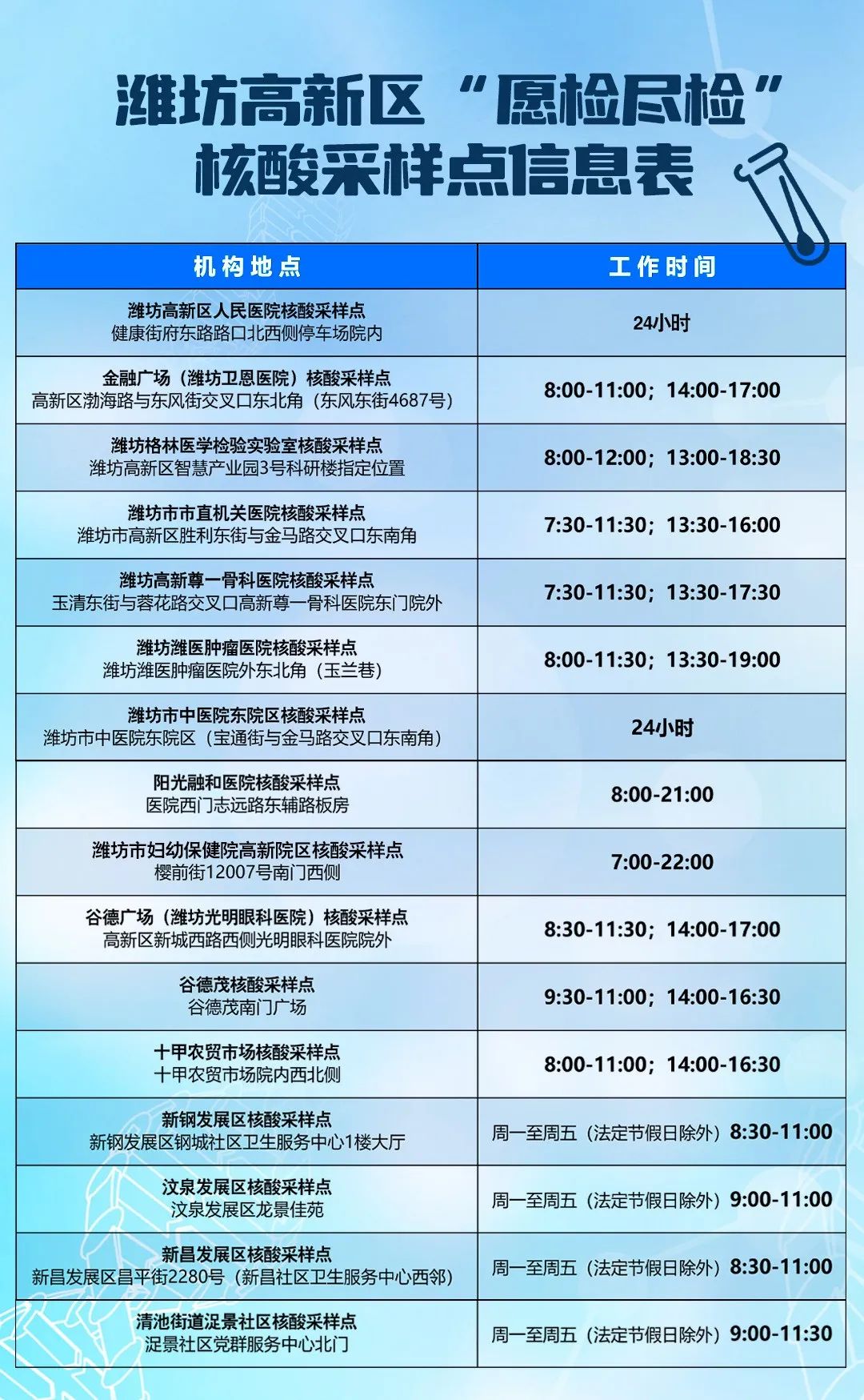 5月16日,潍坊高新区党工委统筹疫情防控和经济运行工作领导小组(指挥部)办公室发布了关于决定每周二在全区范围内开展区域核酸检测的通告,内容如下: