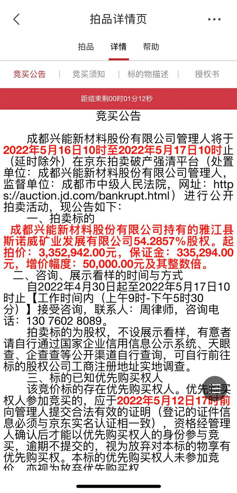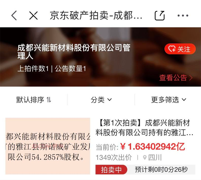 资料显示,此番拍卖的标的是成都兴能新材料股份有限公司(下称“兴能新材料”)持有的雅江县斯诺威矿业发展有限公司(下称“雅江斯诺威矿业”)54.2857%股权。