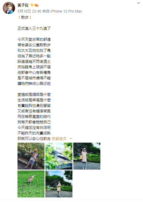 一天前(5月18日)黄子佼还发文透露老婆进入39周,并分享出夫妻两个一起在公园散步互拍的甜蜜画面,照片中,孕晚期的孟耿如挺着超大孕肚,四肢依旧纤细,整个孕期只长胎不长肉,十分令人羡慕。