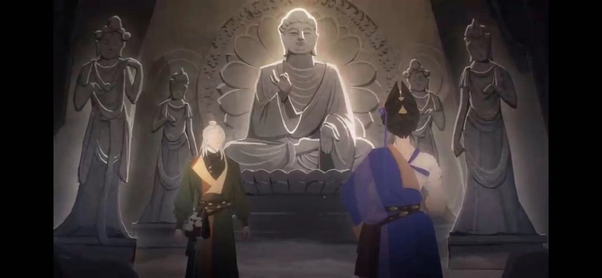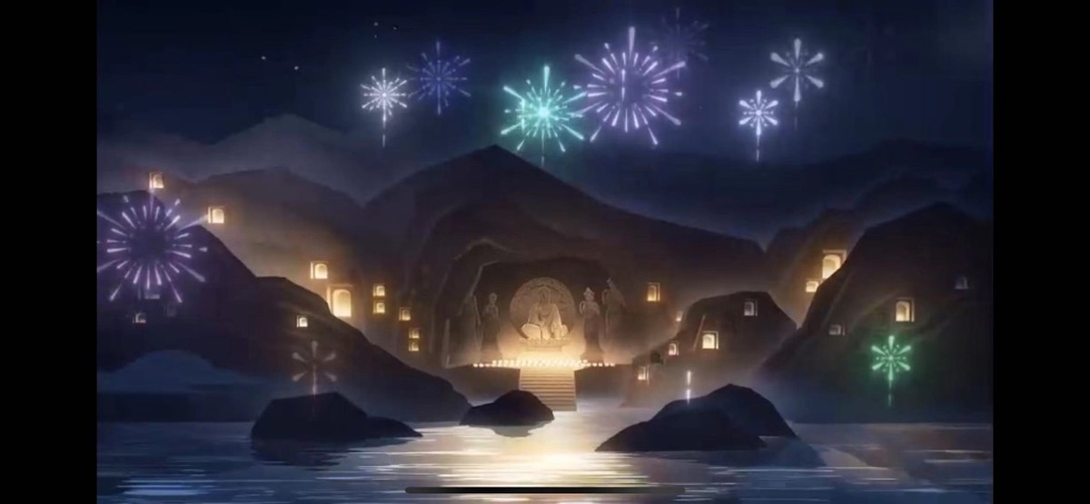 再往后看是黑暗中逐渐显露的一方大佛,佛像面部丰满圆润,身着通肩大衣,自右肩绕回左肩,舒缓的衣褶覆盖全身,飘逸浩荡,显示出舒适悠然的动感。镜头拉远,似乎是石窟中的雕像与壁刻,重山明灭间,一个个石窟洞穴被点亮,更有彩色的烟花升起,这似乎是什么新联动。