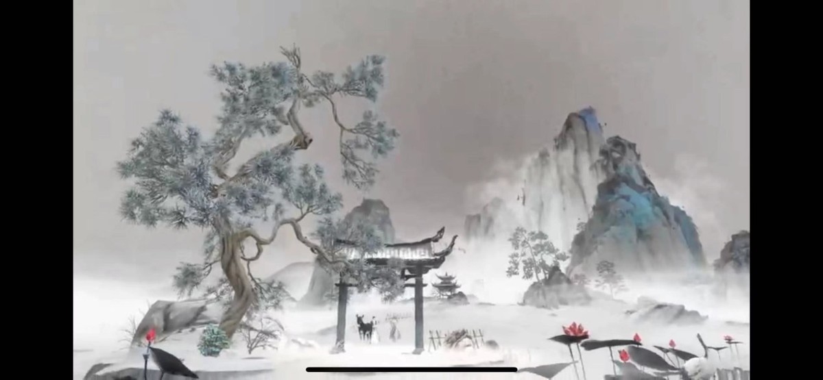 水雾朦胧中山石环绕,斜倚一株松木,还有亭台楼阁依山而建。隐约可见这一切都被收纳进一个台盆,让小编不禁联想到了古代园林艺术。