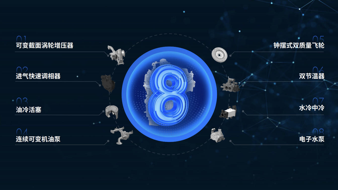 在诸多革新中,电控可变截面(VGT)增压器、燃烧架构设计进气快速调相器、油冷活塞、连续可变机油泵、钟摆式双质量飞轮、热管理模块/双节温器、集成式水冷中冷WCAC、电子水泵EWP等均为亮点技术。其中,电控可变截面增压器有小惯量,低速迟滞少,响应快等特点。集成水冷中冷WCAC则具有散热效率高,瞬态响应性快,进气温度稳定波动小,燃油消耗低等优势。