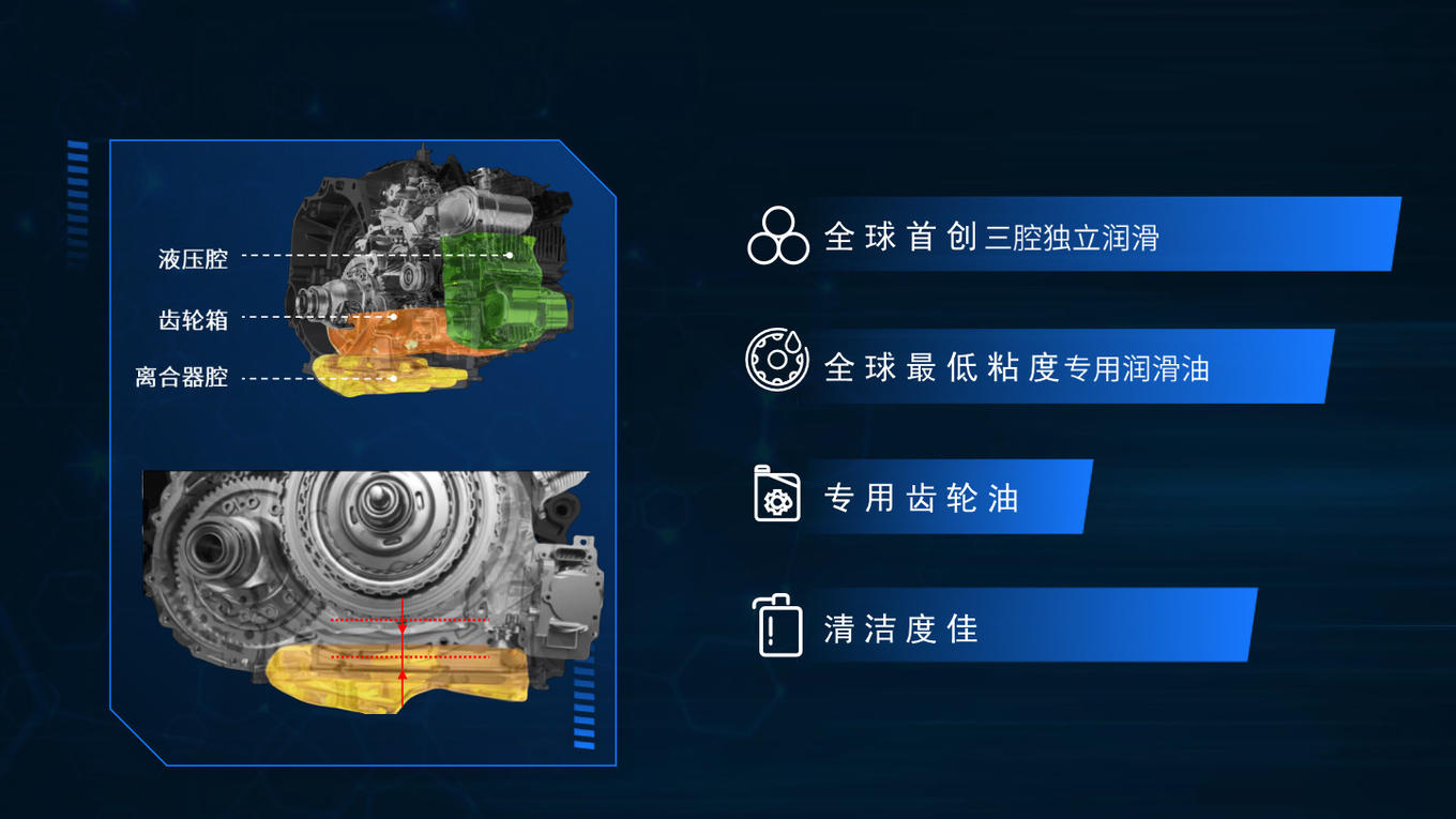 DM21 PLUS自动变速箱采用MSC独立油腔润滑控制系统,同时采用了第六代的低摩擦轴承能使综合效率达到93.5%,最高传动效率达到97%。高压零泄露电液执行系统的应用使变速箱扭矩分辨率达到同级最高水平。基于TCU智能安全控制系统,变速箱具有自适应在线学习能力,可以按照驾驶者习惯的操控方式工作,提供更加舒适的驾驶体验。