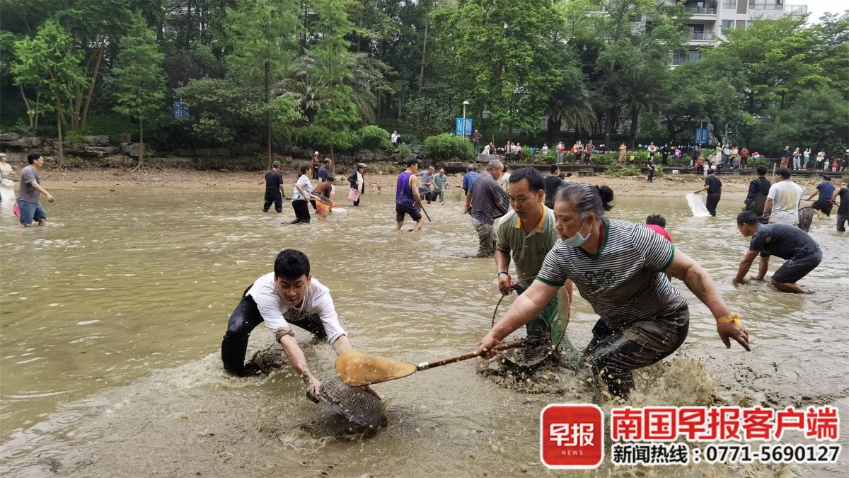 抓鱼欢乐多!南宁一小区上百居民涌进池塘大显身手