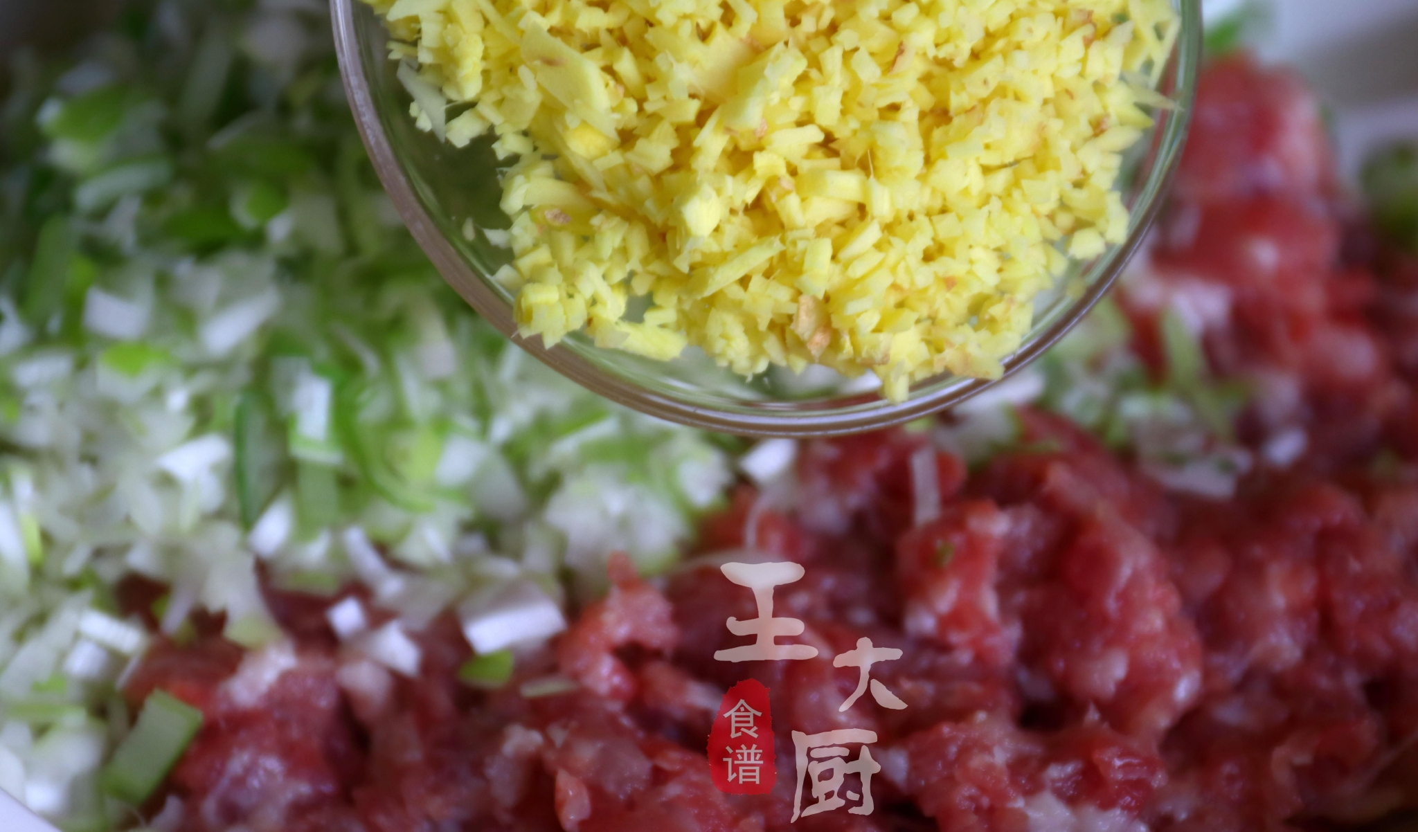 2、将肉末和葱末放在同一容器中,加入准备好的姜末在其中。