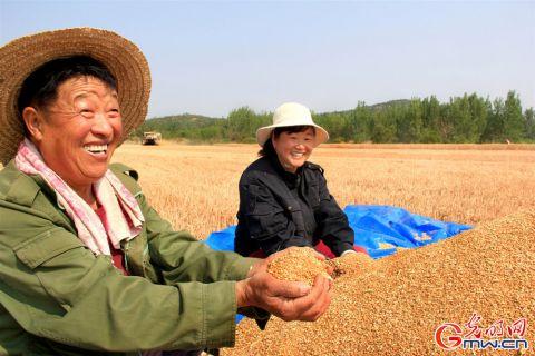 安徽省淮北市烈山区烈山镇蔡里社区田间小麦开镰收割,村民手捧金灿灿的粮食欣喜无比。(周方玲 摄/光明图片)