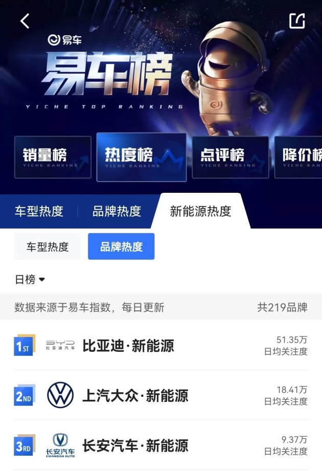 根据易车App“新能源品牌热度榜”数据,比亚迪新能源日均关注度51.35万,位列排行榜第1名。如需更多数据,请到易车App查看。