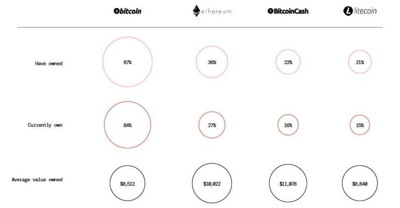 近九成的虚拟货币有者拥有或曾经拥有比特币,相比之下,以太币的持有比例为36%,比特币现金为22%,莱特币为21%。比特币的吸引力还表现在:87%的人表示他们在某个时候拥有比特币,84%的人仍将比特币放在他们的投资组合中。相比之下,21%的加密投资者拥有莱特,目前只有15%的投资者仍然拥有它。