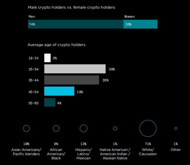 Gemini 的调查显示,持有虚拟货币的人广泛分布在年轻人、男性和白人群体:74%的虚拟货币持有者是男性,77%的所有虚拟货币所有者年龄在45岁以下,71%是白人。数据显示,虚拟货币的“平均”拥有者是一名38岁的男性,年收入约11.1万美元。