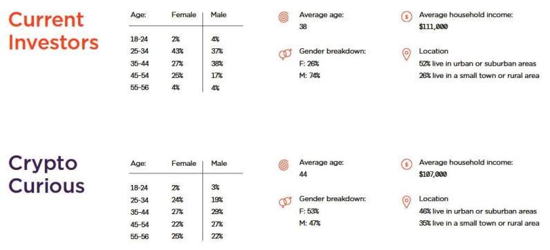 13%的美国成年人计划在未来12个月内购买虚拟货币,即大约1930万美国成年人有增持虚拟货币的意愿。在对虚拟货币感兴趣的群体中,女性的比例达到了53%,而目前持有虚拟货币的女性占比只有26%。同时,年龄方面,年纪稍大的投资者对虚拟货币的兴趣浓厚,意味着美国炒币群体的性别将会更加平衡,平均年龄预计会上升至44岁左右。