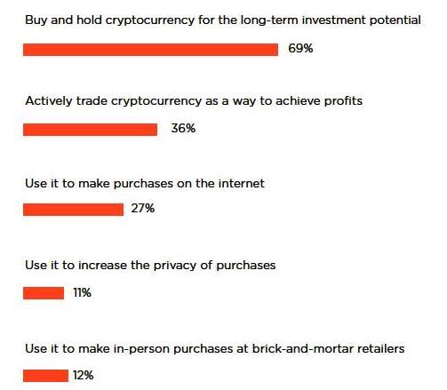 另一个调查发现是,很多虚拟货币持有者并不是day trader,而是“看中虚拟货币的长期投资潜力”。超过三分之二(69%)的人买入并持有货币,相比之下,36%的人通过积极买入和卖出来获取利润,27%的人通过互联网进行购买。