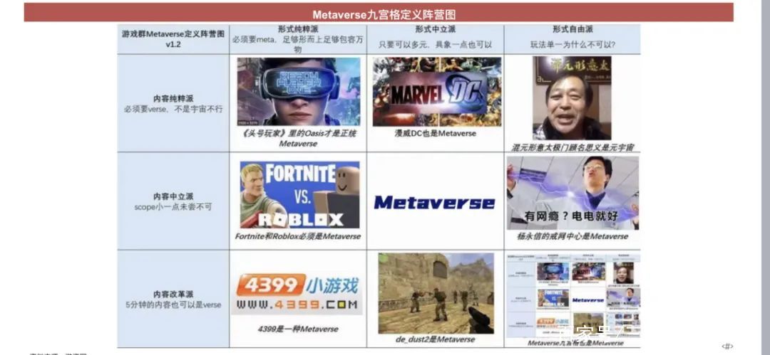 另有一张网络图片,略带恶搞地给各流派眼中的元宇宙分了类: