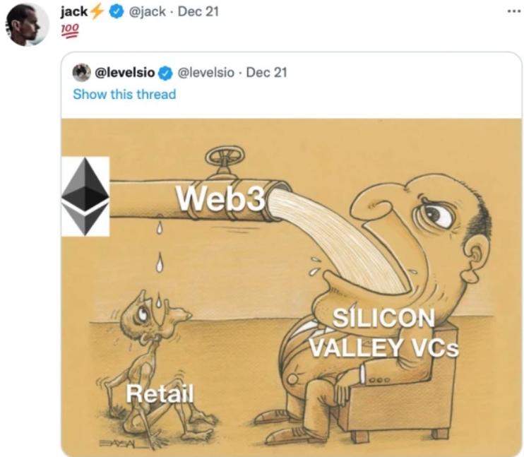 比如推特的创始人杰克·多西就转图讽刺:“ Web3.0 不是把价值归还给用户吗?你们这些代表大资本的风投为啥比用户还起劲?莫非 Web3.0 是假,你们资本赚大钱才是真?”