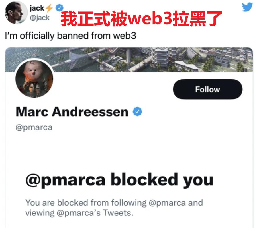 反正一来一回,因为多说了几句 Web3.0 的不是,玻璃心的 Marc Andreessen 直接就把杰克·多西拉黑了。