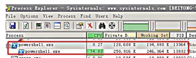 目前无文件型挖矿病毒最常见的攻击对象是powershell,攻击者首先将恶意代码注入到powershell中,再利用powershell执行挖矿,特征为poweshell占用大量的CPU资源,且有攻击类文件创建。