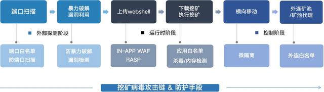 根据挖矿病毒的攻击链,我们可以将攻击分为外部探测、运行时和控制3个阶段,在每个阶段基于不同的防护逻辑,可以有效干预挖矿病毒渗透: