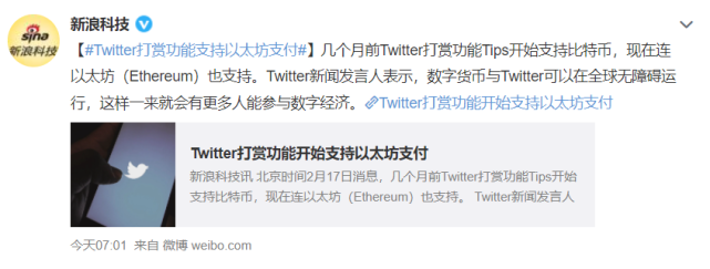 “从今天开始,全球Twitter用户可以将EthereumAddress添加到Tips。
