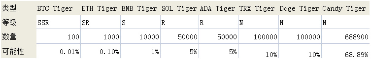 根据每只数字老虎的属性不同,将数字老虎的稀缺性分为5个级别,分别是SSR、SR、S、R、N。数字老虎的数量因级别而异。