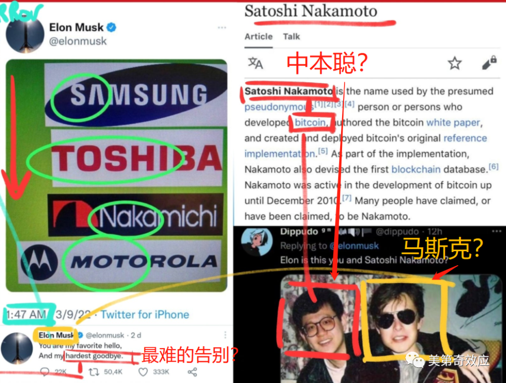 不出几个小时,聪明的网友就发现了老马的谜语,这四家公司,三星集团(Samsung,SA)、东芝(toshiba,TOSH)、中道(nakamichi,NAKA)、摩托罗拉(Motorola,MOTO),四家公司英文名开头字母合起来就是:SatoshiNakamoto。(图上画圈字母)