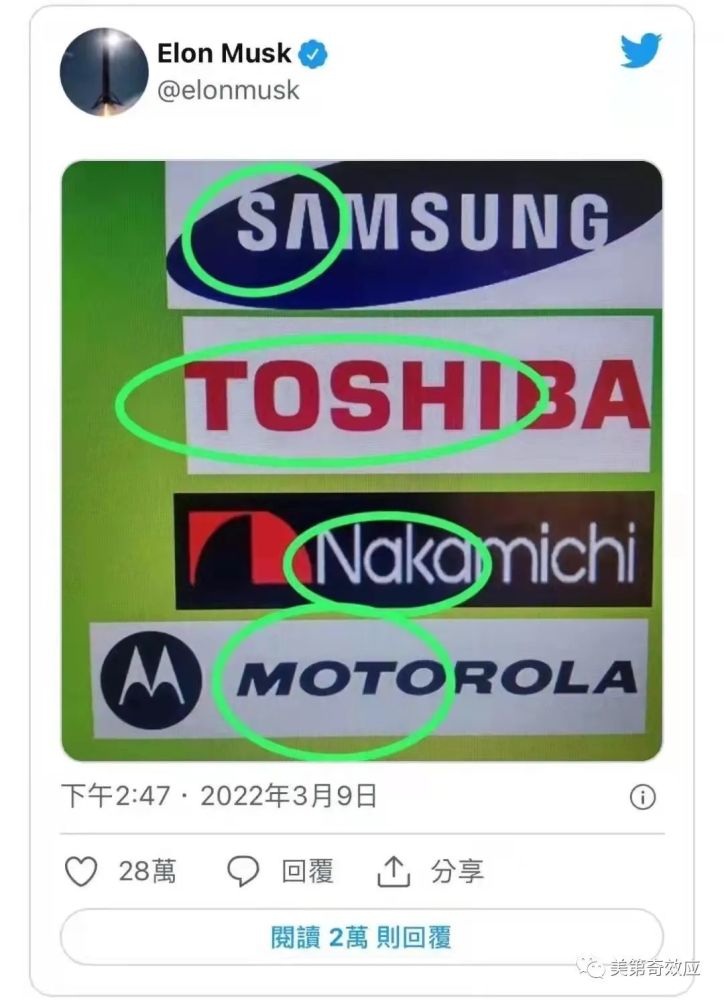 作为推特大V,马斯克贴了三星、日立、中道、摩托罗拉这四家公司的Logo,似乎意有所指。
