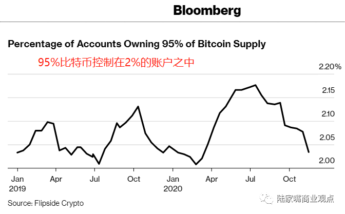 Bloomgerg的研究也显示,95%的比特币,控制在2%的地址中,而头部的巨鲸,可能又拥有多个头部地址,使得比特币作为对抗FIAT货币所谓的“去中心化”变成一句笑话(比特币的集中度,比任何一种FIAT货币都高得多)。