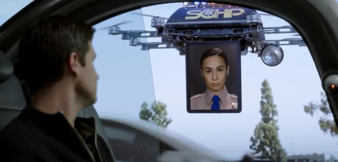 当然,追求自由刺激的Brown经常关闭汽车的AI,将其切换成手动模式在一众有序行使的自动驾驶汽车群中狂飙,即使每次被警察拦截都以自己的汽车存在故障为接口耍赖。值得注意的是,未来警察在执法时已经不用肉身出警,而是变成了更加便捷酷炫的无人机。