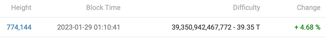 摘要:2023 年 1 月 29 日星期日,比特币区块链的区块高度为 774,144,再次出现难度增加。该网络的难度增加了 4.68%,从 37.59 万亿增加到 39.35 万亿的历史新高。