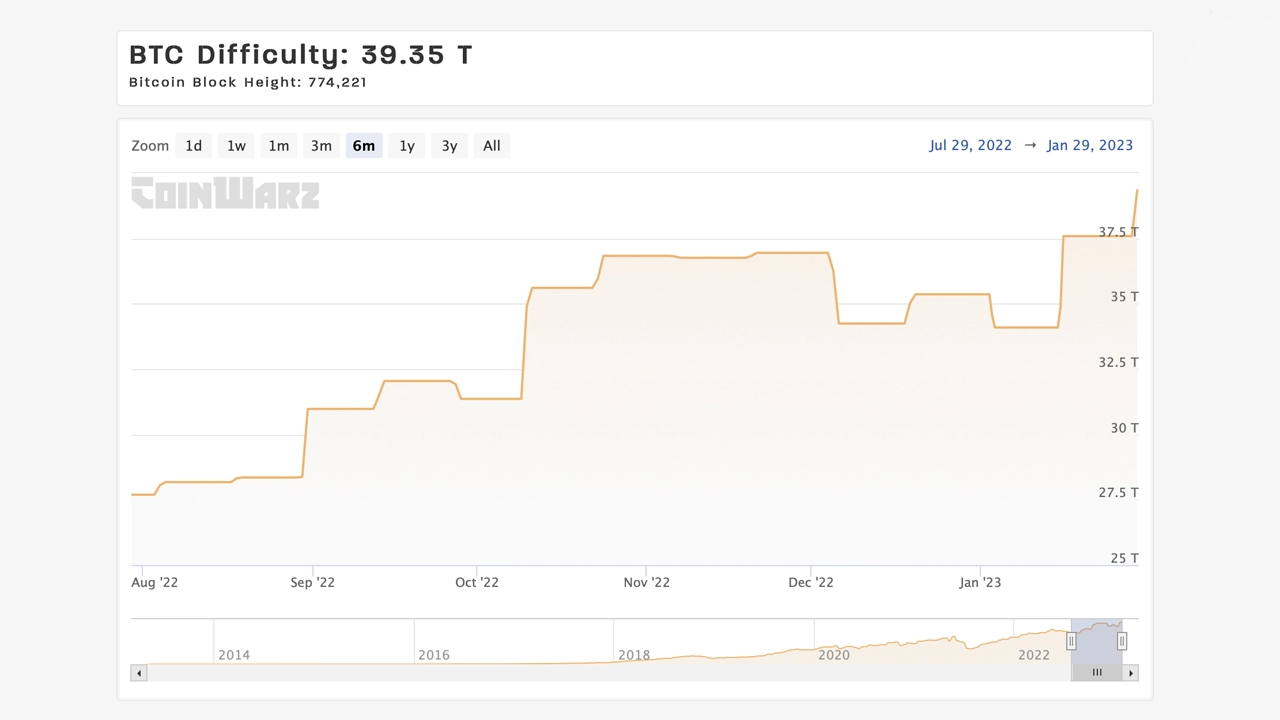 在周日上涨 4.68%之后,比特币的难度再创历史新高,超过两周前创下的纪录。增加发生在早上 6 点 10 分(UTC)的区块高度774,144。目前难度为39.35万亿,接近突破40万亿。下一次调整将于 2023 年 2 月 11 日到期。