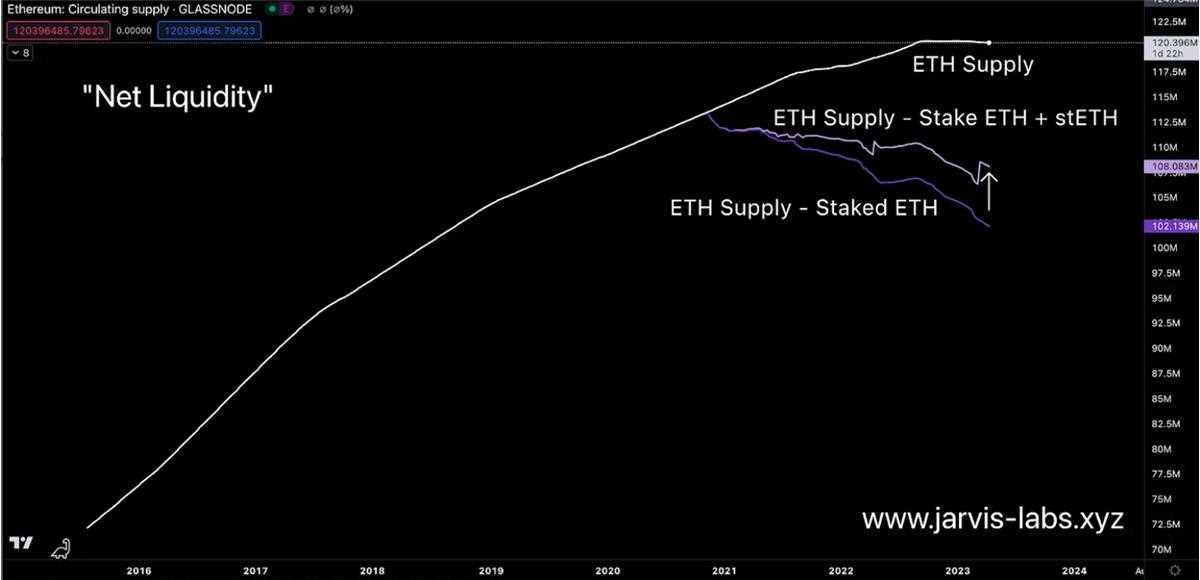 这种方法问题在于,由于 Lido、Frax、Rocket Pool 与其他人带来了流动性质押衍生产品(LSD),他们实质上促使质押的 ETH 再度具备流动性。这就意味着这类净流动性见解从一开始就存有固有缺陷。
