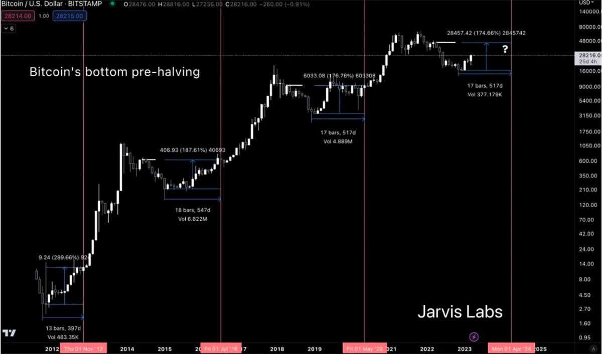 历史时间说明,在BTC 每一个限产事情前 13-18 个月中间,价格也止跌。我们目前间距下一个递减也有 12 个月,依据这个历史,这也是为什么 BTC 价钱近期一直在大涨的缘故。