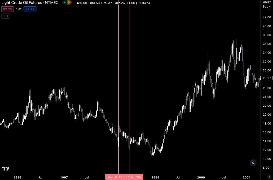 这是因为 1998 年 3 月和 6 月公布的全世界减产协议而致。有意思的是,在各种限产对策执行以前,己经看见了价钱有一定的行为。下边的图表显示了石油期货的价格,并且在那一个时间范围上边画上一条竖直的红线。一定要注意该时间范围周边的价格波动。出现2次大幅上涨超出 20%的现象,表明市场预测也会减少石油供应。