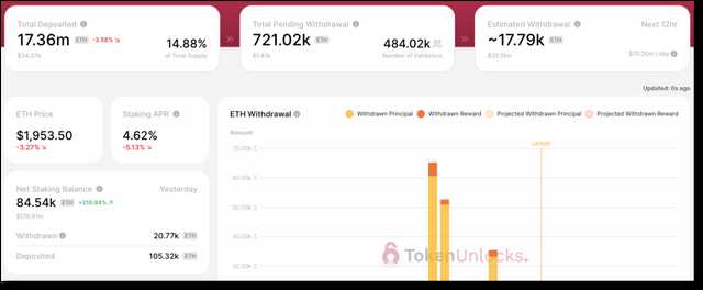 据Token Unlock实时动态,从上海市升级进行到4月20日在下午4点一周时间里,一共有133万ETH申请办理明确提出,而在此期间也有65.56万 ETH存进,净流出总数大约为67.44万枚。